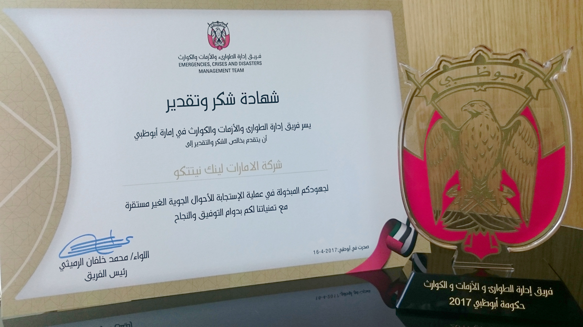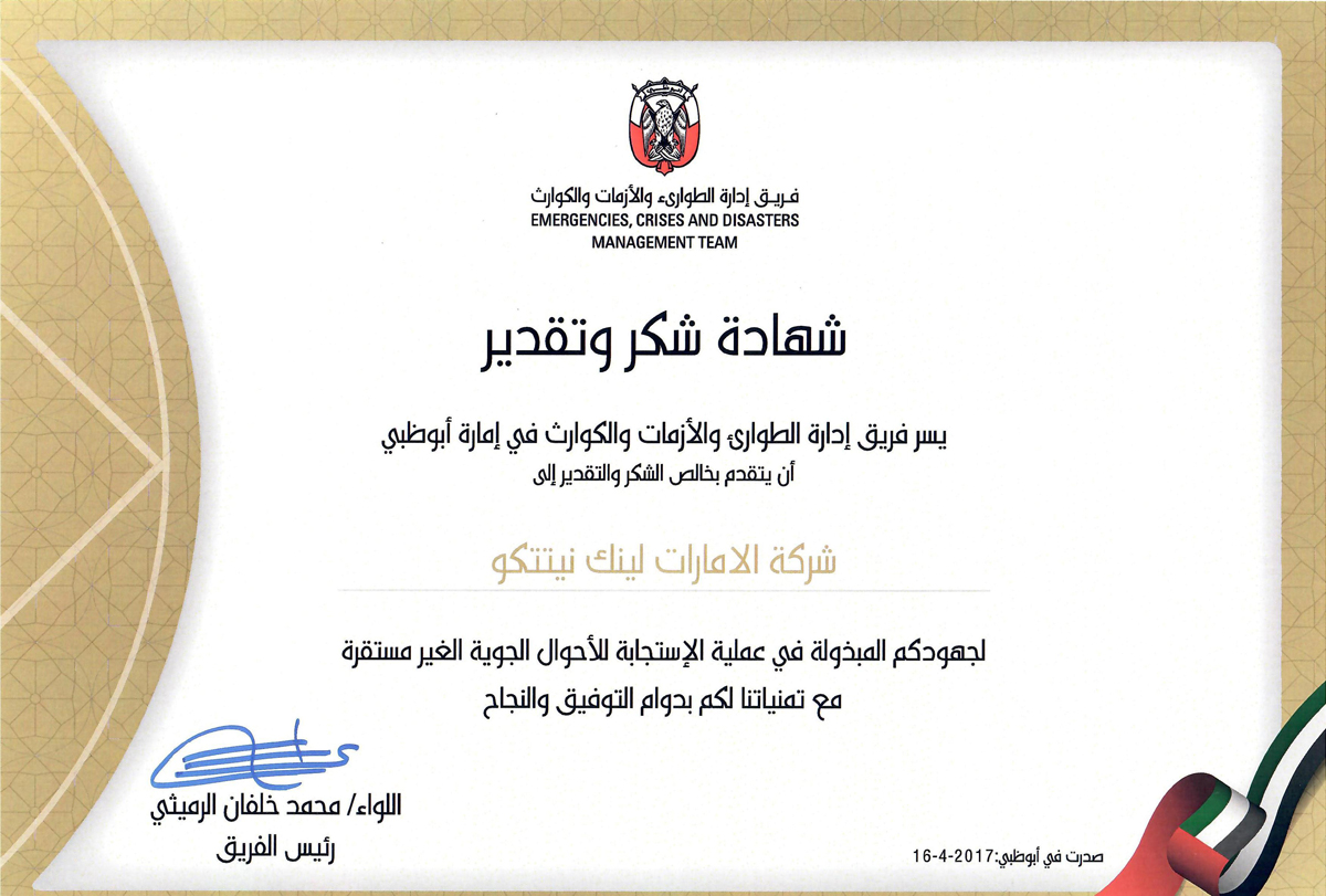 ELNITCO – National Emergency Crisis and Disaster Management Team – Abu Dhabi elndev Emirates Link NITCO LLC, Latest News, Post Types 25.04.2017 ELNITCO receives honorary Certificate on 25th April 2017 for the efforts during the weather crisis in 2017 given by H.E. Major General Mohammed Khalfan Al Romaithi